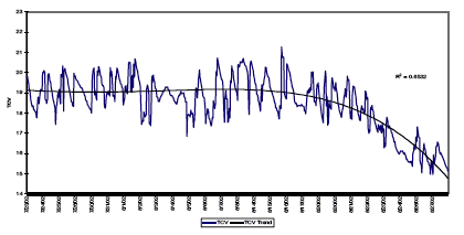 一個標準的安裝位置on-engine劍橋粘度計在潤滑油返回行。附表3顯示了結(jié)果在一個類似的引擎。正如您可以看到的,即使有溫度補償,粘度變化大致+ / - 1 cP周圍的趨勢線。這一趨勢線19.2 cP 8/14/02周圍開始下降。這一趨勢顯然仍在繼續(xù)下降,跨越18 cP在4天內(nèi)和將近兩周下降到15 cP。引擎繼續(xù)失敗,原因是燃料稀釋。展品3和4顯示粘度的趨勢引擎與劍橋粘度計檢測。在每種情況下,劍橋傳感器預測大量石油的質(zhì)量問題導致引擎的問題和失敗。